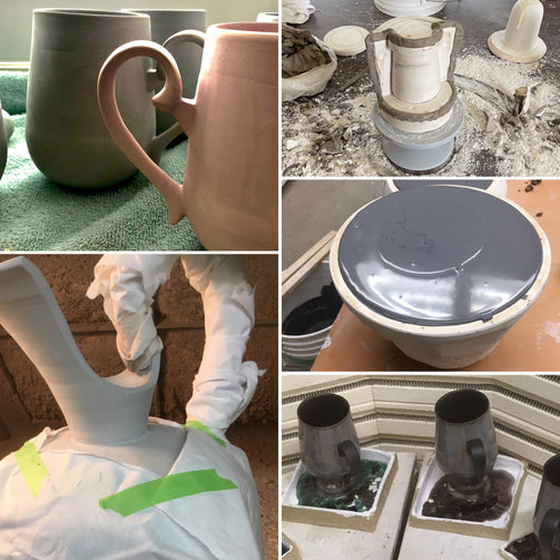 All work is created using casting slip, a type of liquid clay that is poured into plaster molds to achieve its shape. Plaster molds, clay, and glazes are all handmade in studio.